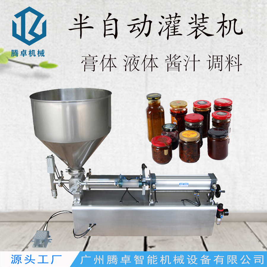 可用于灌裝含顆粒物醬料、膏體、液體等各種物料;物料接觸部分均采用304不銹鋼材質;帶攪拌料箱,氣動控制灌裝,操作簡單,拆裝清洗方便;