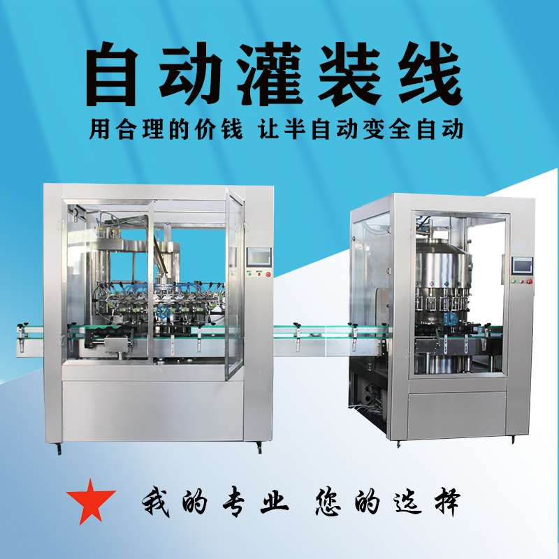 完成動作:人工放瓶-自動洗瓶灌裝-機器放蓋-自動旋蓋–自動貼標套標-人工收瓶或接自動裝箱