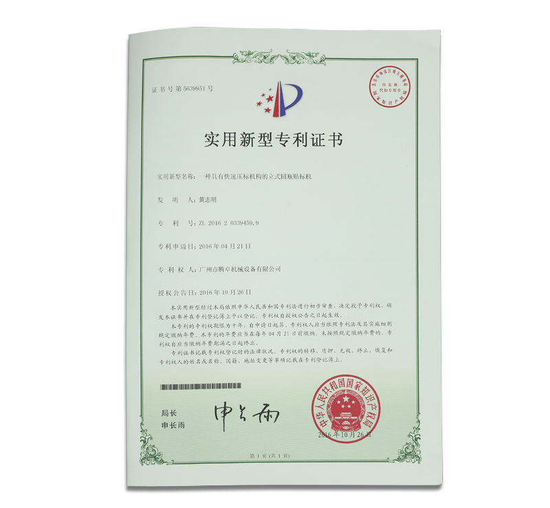 騰卓機(jī)械專(zhuān)利生產(chǎn)證書(shū),專(zhuān)業(yè)制造包裝設(shè)備的生產(chǎn)廠(chǎng)家,全自動(dòng)及半自動(dòng)的洗瓶機(jī),烘干機(jī),灌裝機(jī),旋蓋機(jī),貼標(biāo)機(jī),套標(biāo)機(jī),打碼機(jī)等非標(biāo)定制自動(dòng)化包裝生產(chǎn)線(xiàn)